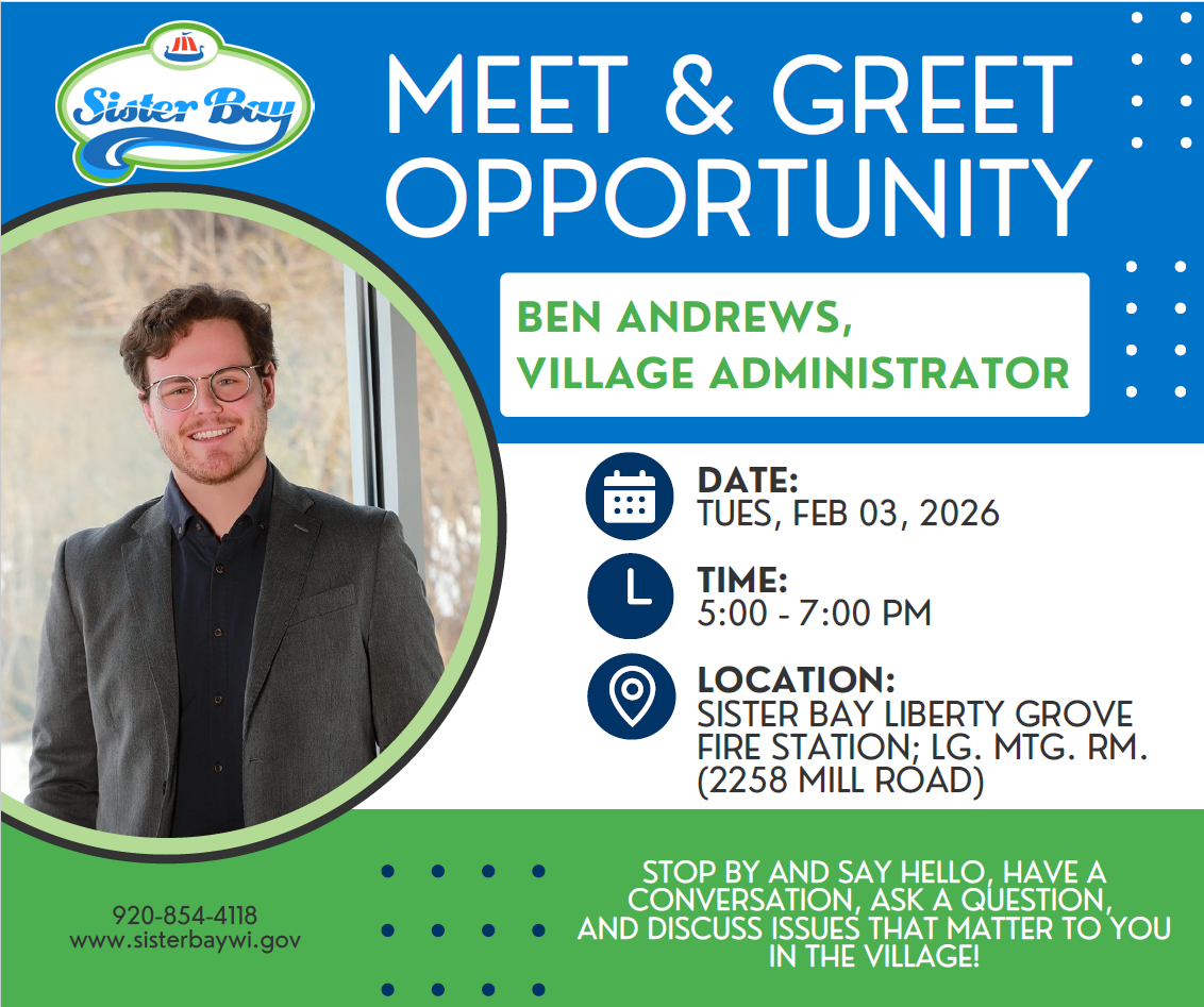 The Village of Sister Bay is pleased to invite residents and community members to a Meet and Greet with Benjamin “Ben” Andrews, the recently appointed Village Administrator. This event will take place on Tuesday, February 3, 2026, from 5:00 PM to 7:00 PM at the Sister Bay Liberty Grove Fire Station - Large Meeting Room (2258 Mill Rd, Sister Bay, WI 54234).
