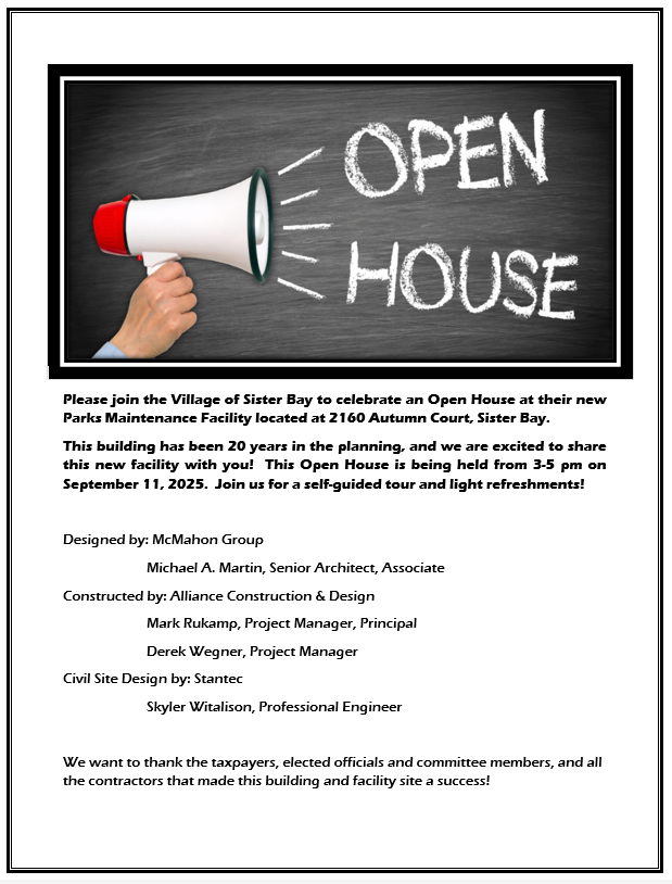 Please join the Village of Sister Bay to celebrate an Open House at their new Parks Maintenance Facility located at 2160 Autumn Court, Sister Bay.
